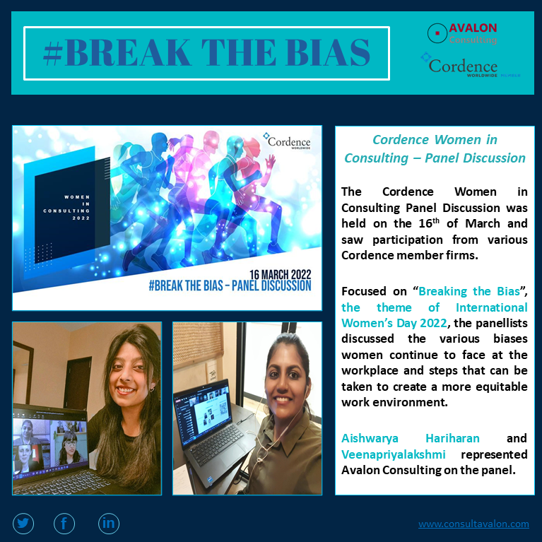The first step towards breaking the bias is to be open and speak up about it. That is what we did in “Cordence Women in Consulting Panel Discussion” to celebrate gender equality and inclusiveness. Avalon Consulting was represented by Veenapriyalakshmi Venkatesan and Aishwarya Hariharan who highlighted the stereotypes women face in Indian workplaces and how we should address them.